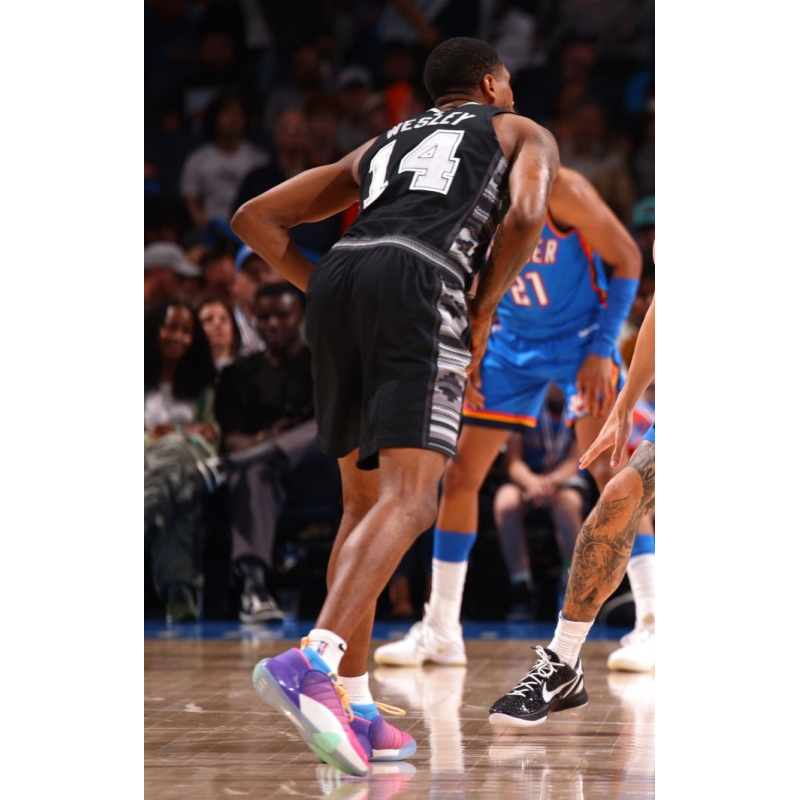 Blake Wesley last game on 2026-04-12 against Sacramento Kings played in Nike Air Zoom G.T. Cut 3 Triple Black.