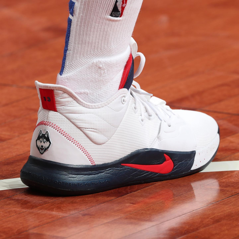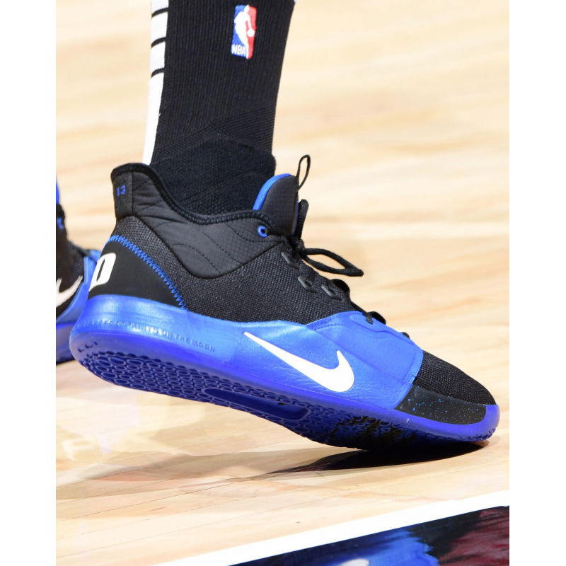 BEYOND COMFORTABLE. Paul George's moonshot took him from Palmdale to basketball stardom, and now he's headed to new heights with clouds under his feet. Built on an outsole inspired by moon craters, the PG 3 combines sensational traction with responsive Zoom Air cushioning that helps you move seamlessly between offense and defense. Pure Comfort 1/2-bootie construction creates a snug, secure fit. The padded collar finished with smooth, durable fabric hugs the ankle without sacrificing agility. Moon-Inspired Traction An outsole pattern inspired by craters on the Moon provides excellent multidirectional traction with a distinct aesthetic. Responsive Cushioning A Zoom Air unit in the forefoot offers responsiveness to help drive you down the court. The Sky Is Not the Limit The phrase "Don't tell me the sky's the limit when there are footprints on the moon" is molded into the heel, a testament to Paul George's out-of-this-world game.